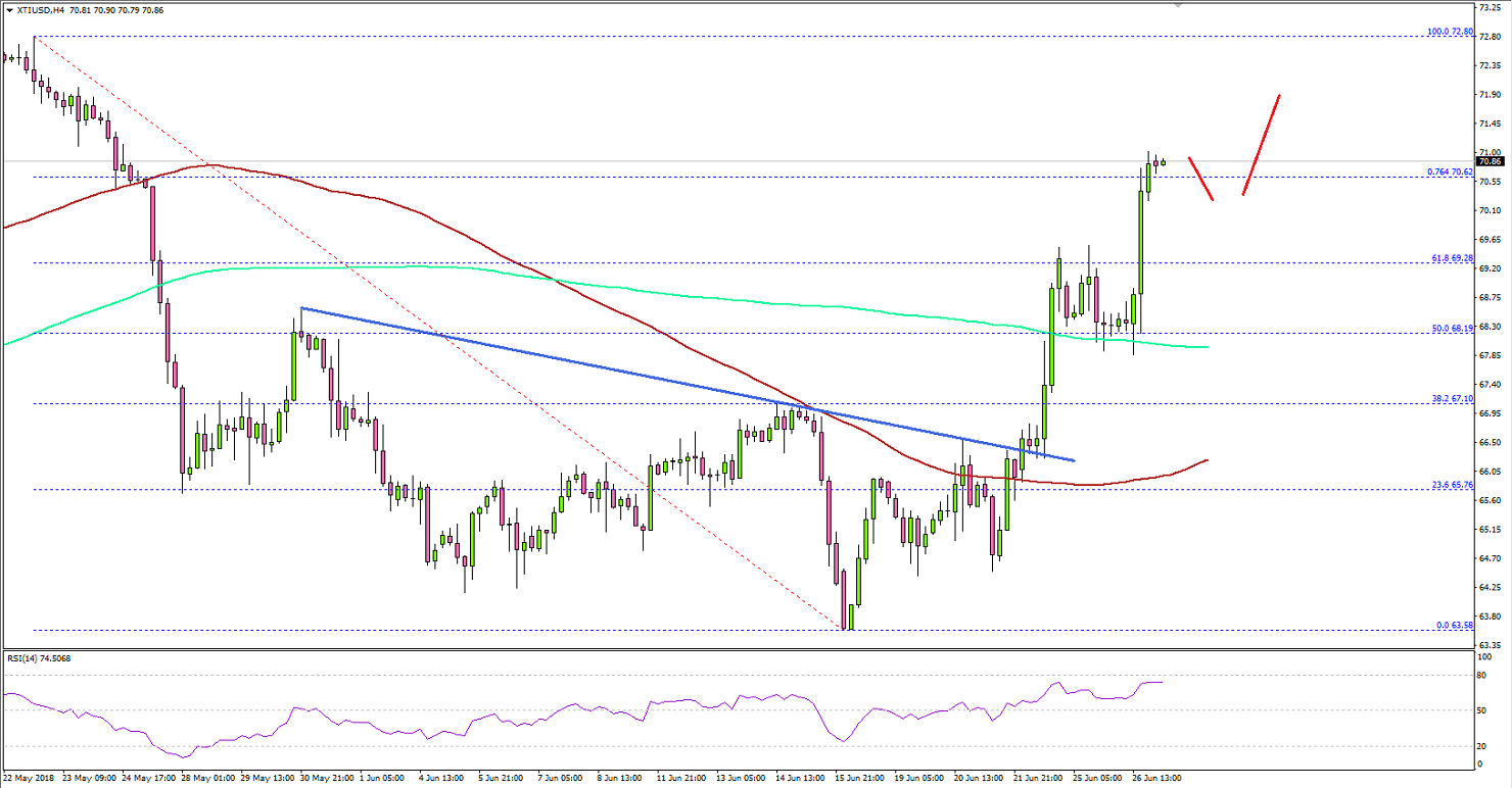 More importantly, there was a break above a key bearish trend line with resistance at $66.00 on the 4-hours chart of XTI/USD. The price climbed above the $68.00 level and the 100 (red) and 200 (green) simple moving averages (4-hours).However, the upside move was slightly capped by the 76.4% Fib retracement level of the last decline from the $72.80 high to $63.58 low. The price is currently consolidating above the $70.00 support.On the upside, the price must break the $72.00 resistance to gain traction. Above $72.00, the price may revisit the $75.00 zone. A failure to climb above $71.00 and $72.00 may perhaps result in a bearish reaction back towards $68.00.Recently in the US, the S&P/Case-Shiller Home Price Indices figure for April 2018 was released by the Standard & Poor's. The market was looking for a rise of 6.8% in April 2018 compared with the same month a year ago.However, the actual result was below the market forecast since there was a change of 6.6%. Moreover, the last reading was revised down from 6.8% to 6.7%. There was no major impact on the US Dollar, but pairs like EUR/USD and GBP/USD still remains supported on the downside.Economic Releases to Watch Today