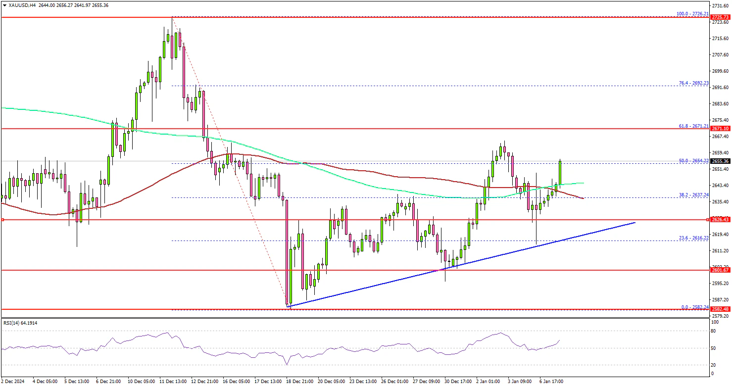 价格已经突破了100简单移动平均线(红色,4小时)和200简单移动平均线(绿色,4小时)。向上的初步阻力位在2,670美元,这接近从2,726美元高点到2,582美元低点下跌趋势的61.8%斐波那契回撤位。