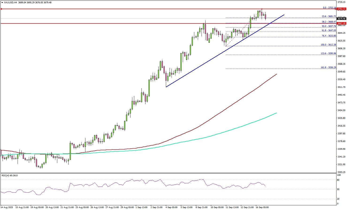 金价创下 3,701 美元附近的新高,并可能继续上涨。上行方面,当前阻力位在 3,700 美元附近。下一个主要阻力位在 3,715 美元附近。