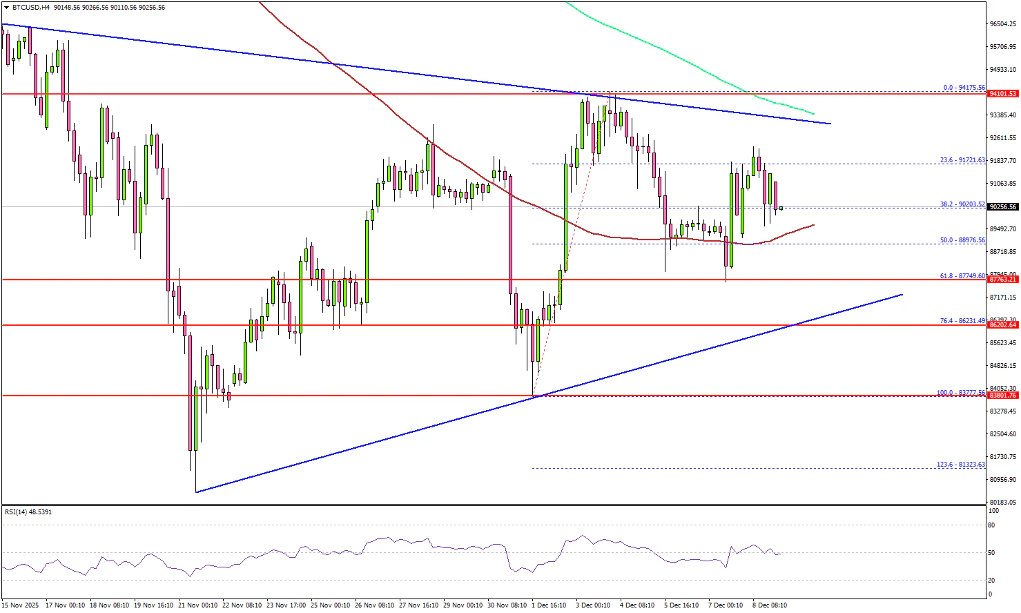 从 4 小时图来看,价格甚至突破了 92,000 美元,但在 94,200 美元附近遇到卖压。近期价格回落至 92,000 美元下方,并测试了从 83,777 美元低点到 94,175 美元高点这段反弹的 50% 斐波那契回撤位。