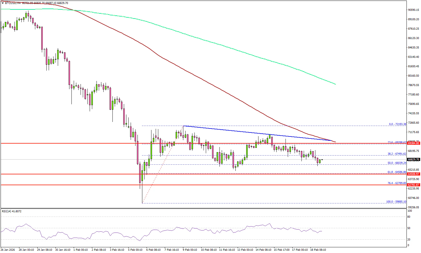 价格还远低于100期简单移动平均线(红色,4小时)和200期简单移动平均线(绿色,4小时)。近期支撑位在66,000美元。首个关键支撑位可能在64,500美元,即从59,885美元低点到72,193美元高点的反弹波61.8%斐波那契回撤位。