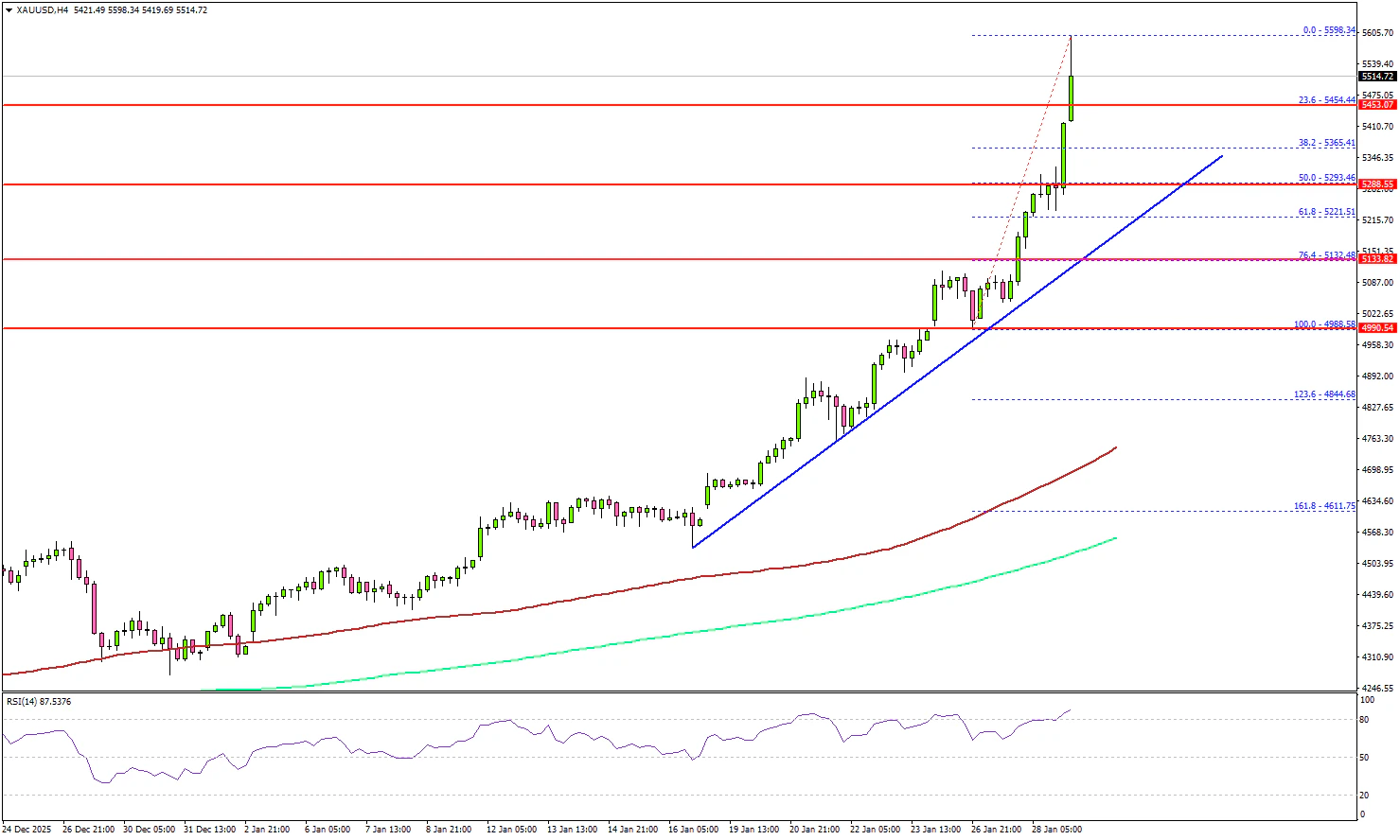 下方支撑:回调时黄金可能在 $5,450 获得买盘支撑。首要支撑在 $5,280,同时上升趋势线也在 $5,280 提供支撑,下方价格可能回落至 $5,000。主要支撑位在 $5,000。若进一步下跌,可能测试 4 小时 100 简单移动均线(红色)$4,700 或 200 简单移动均线(绿色)$4,550。