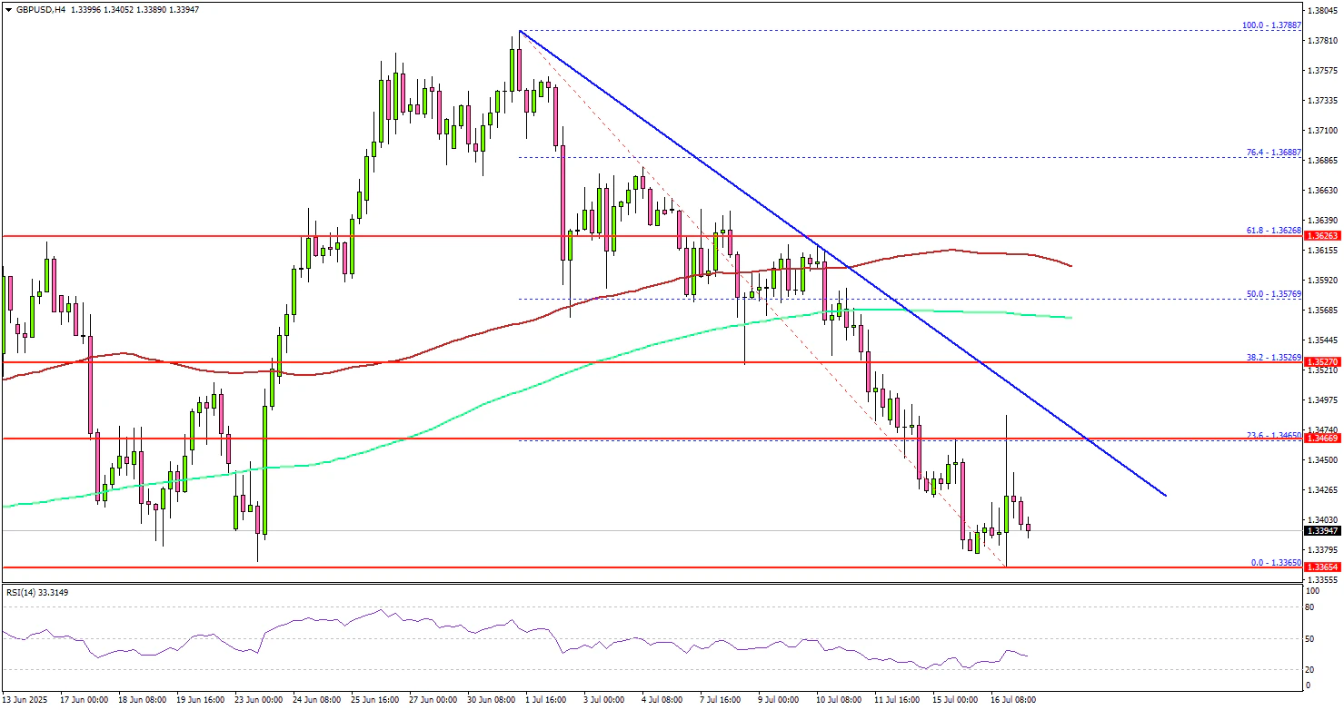4小时图上,该货币对跌破1.3500区域、100简单移动平均线(红色,4小时图)和200简单移动平均线(绿色,4小时图)。多头在1.3360区域附近站稳。