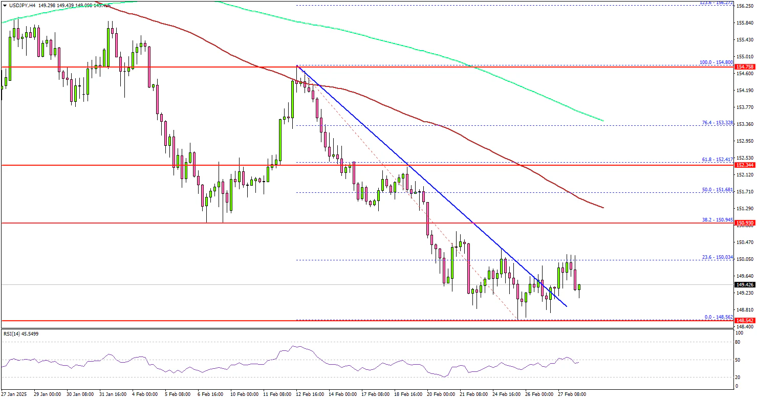 同一图表上,该货币对突破了一条关键的下降趋势线,阻力位在149.20。然而,上行方面,该货币对在150.50水平附近面临阻力。