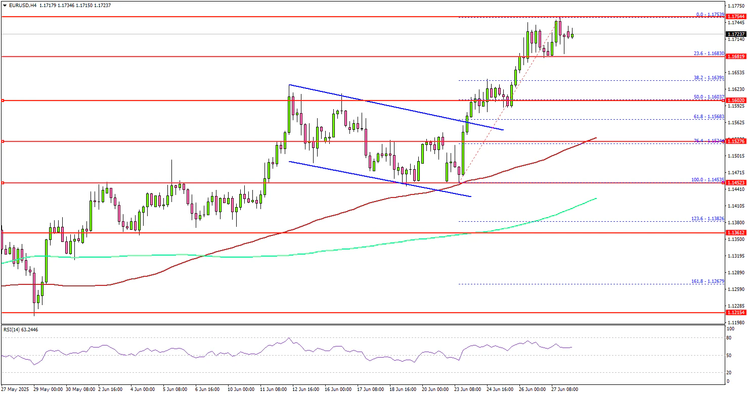 欧元兑美元开始稳步上涨,突破1.1650阻力位。欧元/美元突破重重阻力,进入上涨区域。
