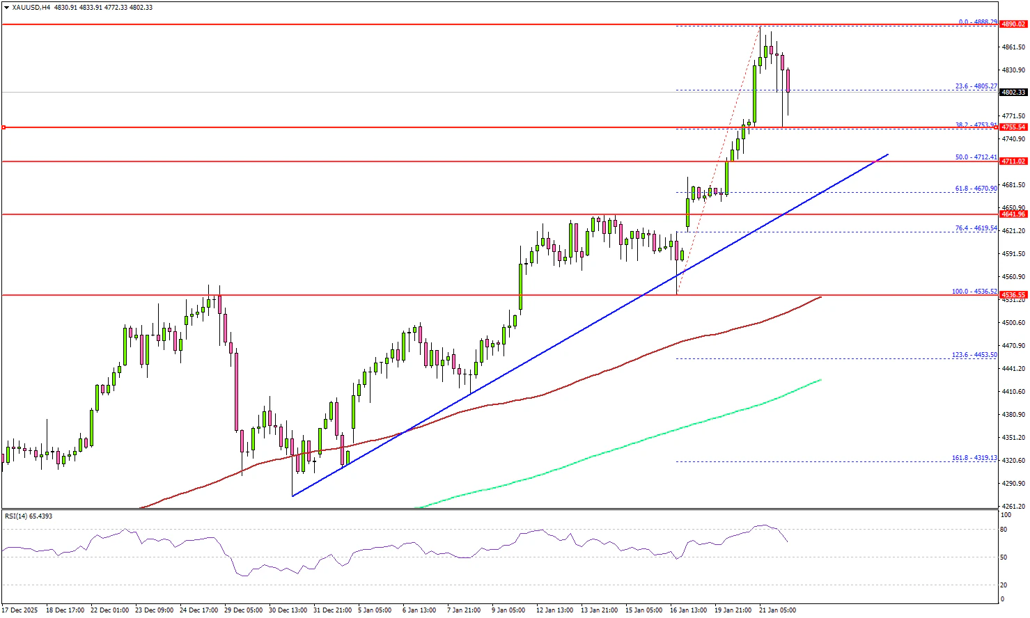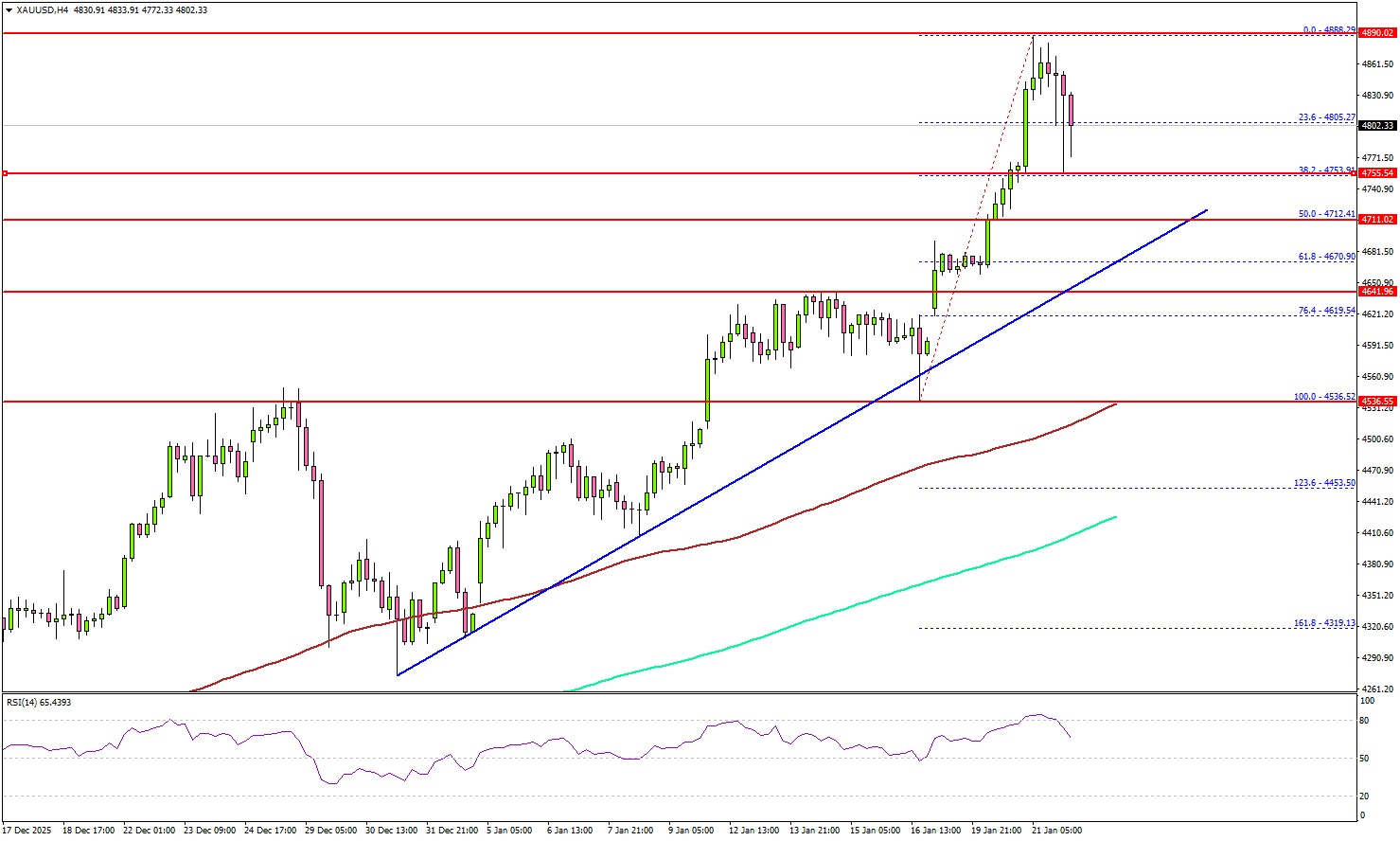 关键支撑位位于 4,670 美元,同时在该位置形成一条连接的看涨趋势线。若进一步下跌,价格可能测试 4 小时图上的 100 简单移动平均线(红色)4,530 美元,甚至 200 简单移动平均线(绿色)4,400 美元。