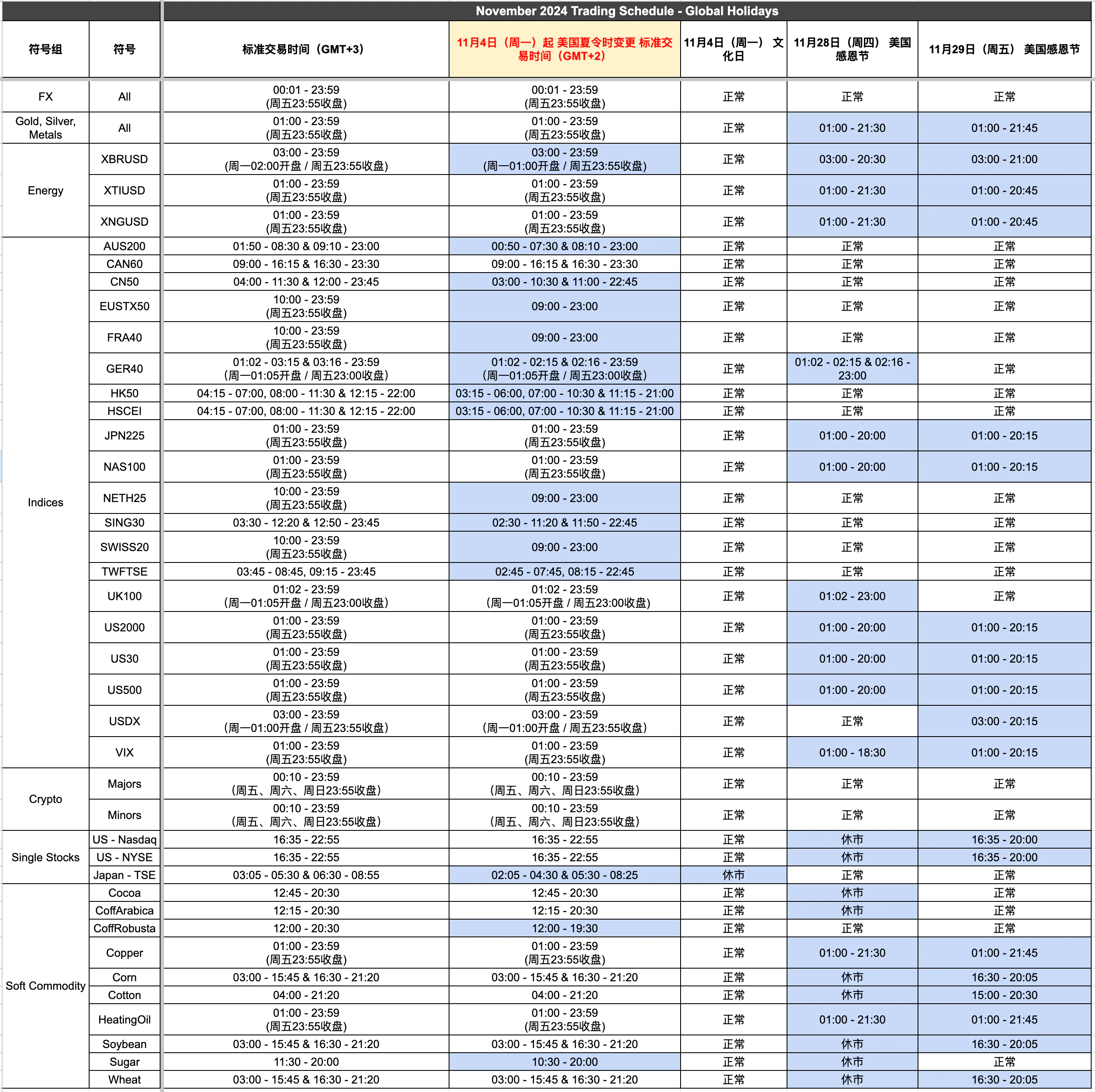 Titan FX Team 28th October 2024 由于即将到来的美国夏令时变化,我们的交易服务器将从GMT+3切换为GMT+2。因此,多个产品的交易时间将进行调整。此外,11月的感恩节假期和文化日也将影响某些产品的交易时间。请参阅下方表格以了解所有这些变更的详细信息。请点击图片放大查看。除上方标明的情况外,市场将照常开放。