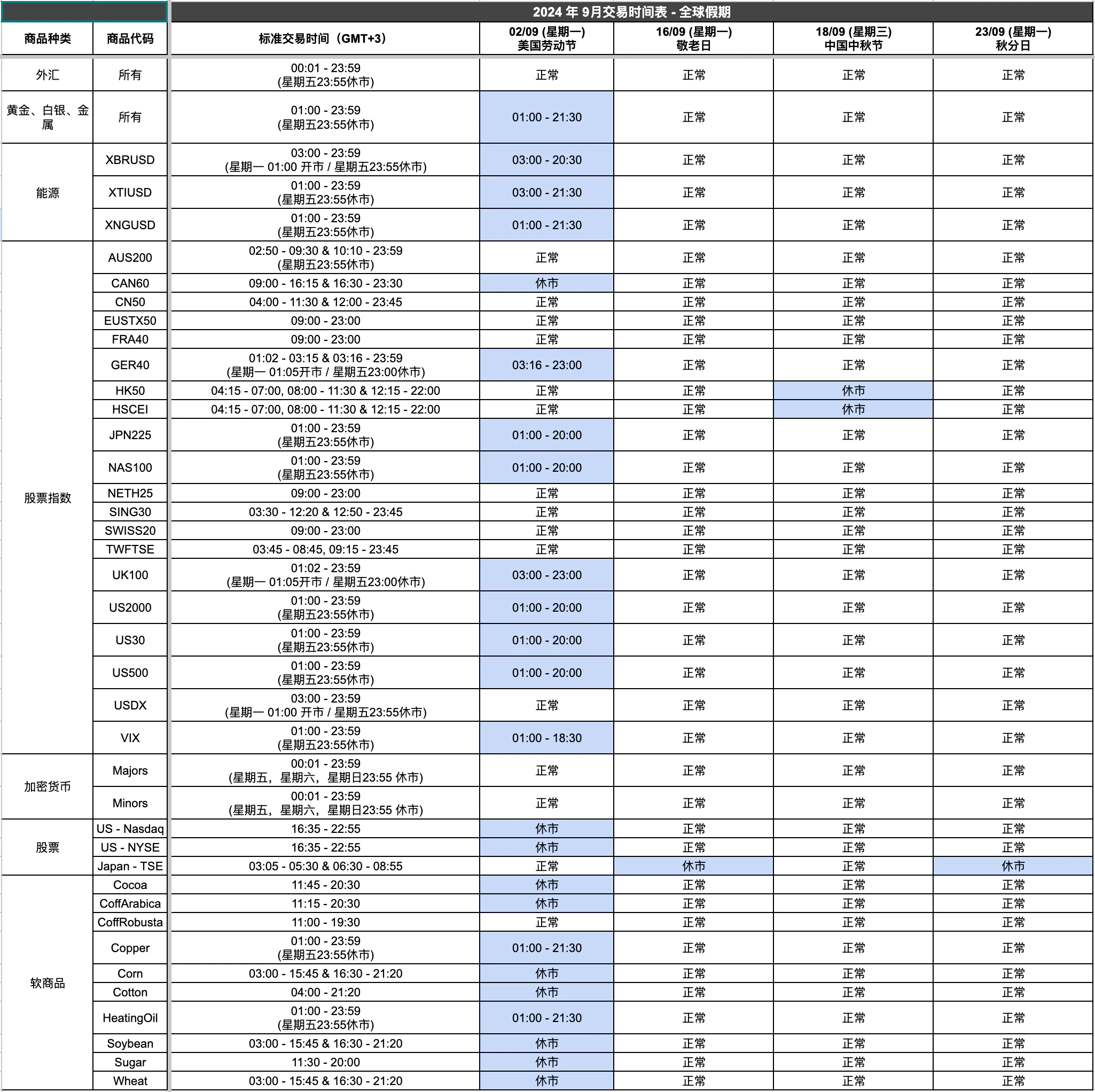 Titan FX Team 30th August 2024 由于美国劳动节、敬老日、中秋节和秋分的关系,九月份部分可交易产品的市场交易时间将有所调整。请查看下表以获取所有这些变化的完整详情。请点击图片以放大查看。除上述所提及的情况外,市场将照常开放。显示的时间为新的GMT+3服务器时间。