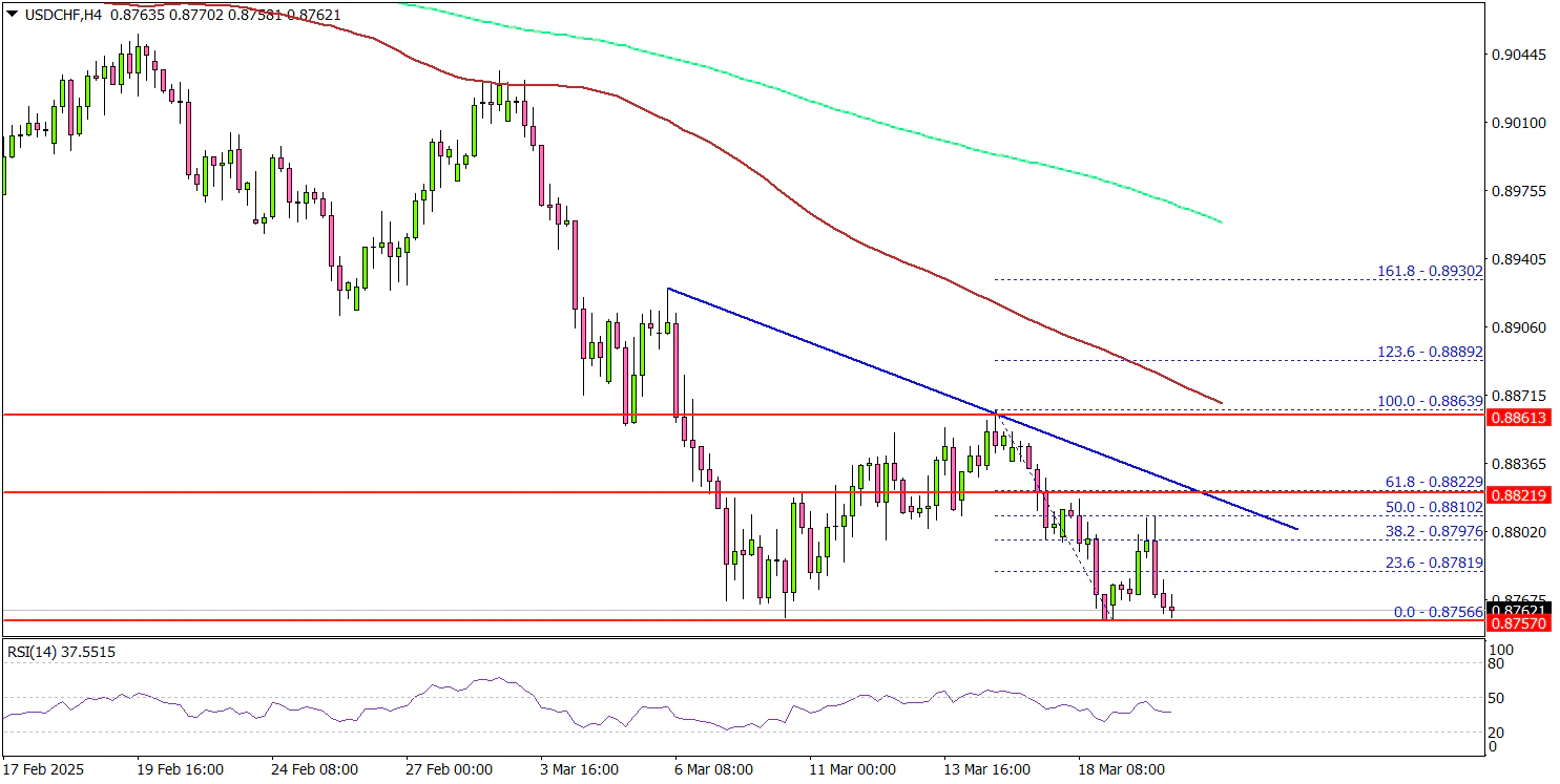 美元兑瑞士法郎大幅下跌,跌破0.8850水平。USD/CHF甚至一度跌至0.8750附近,随后找到了一些支撑。