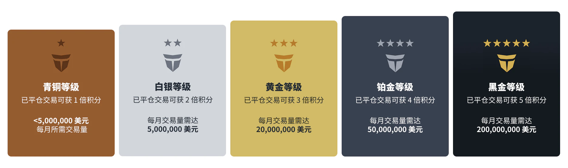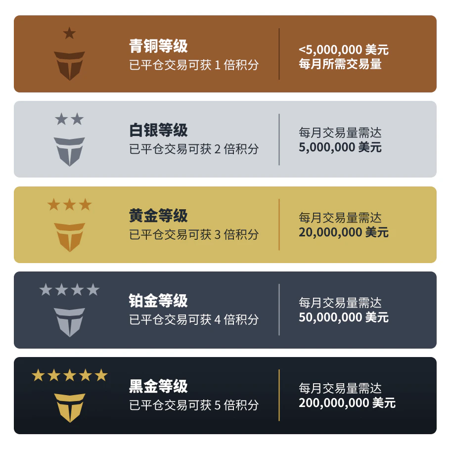 交易越多,等级越高,获得的积分也越多。每月的交易量将决定您的等级。达成当月目标即可晋升或维持当前等级;若未达成目标,等级可能在下个月下降。只要提升交易量,您就能再次升级。