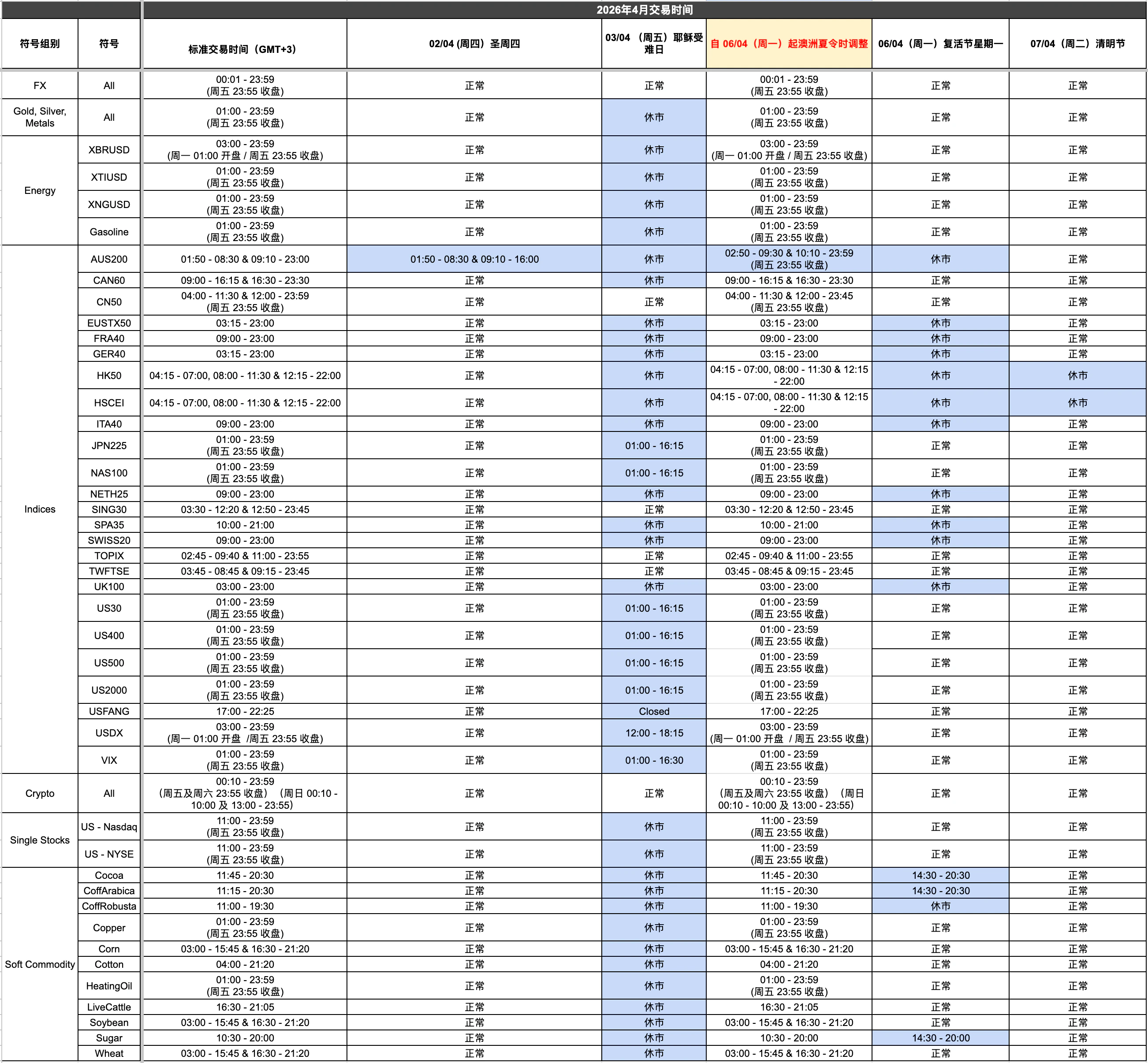 Titan FX Team 30th March 2026 由于澳大利亚夏令时(DST)调整,部分产品的交易时间将有所变动。同时,受澳洲夏令时调整影响,并叠加复活节及清明节等公共假期,部分产品的交易时间也将因此发生变化。请参阅下方表格以了解所有相关调整的详细信息,并据此合理安排您的交易。请点击图片放大查看。除上方标明的情况外,市场将照常开放。