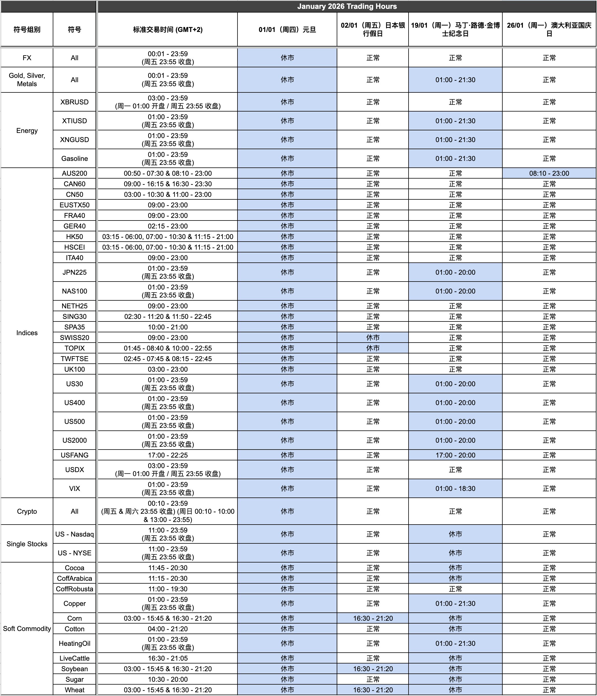 Titan FX Team 14th January 2026 由于一月公共假期,部分产品的交易时间也将随之调整。请参阅下表,了解所有变更的详细信息,并据此规划您的交易。请点击图片放大查看。除上方标明的情况外,市场将照常开放。