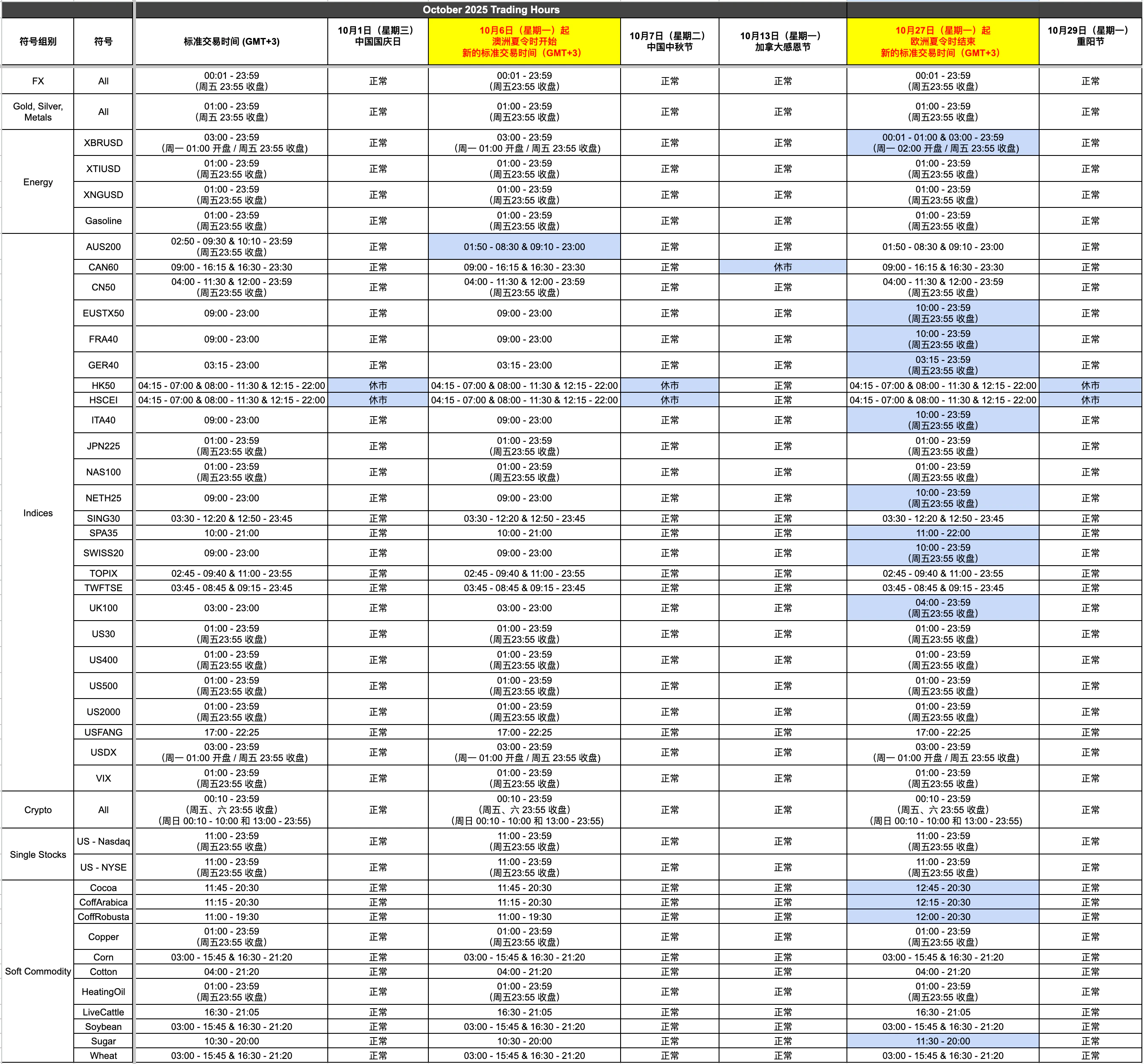 Titan FX Team 29th September 2025 由于10月公共假期,部分产品的交易时间将随之调整。请参阅下表,了解所有变更的详细信息,并据此规划您的交易。请点击图片放大查看。除上方标明的情况外,市场将照常开放。