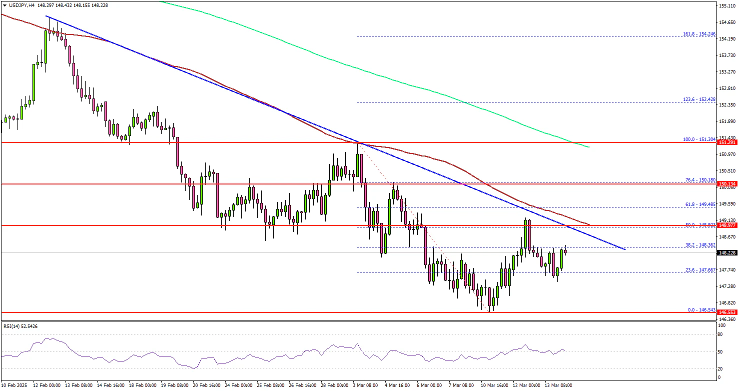 - A major bearish trend line is forming with resistance at 148.80 on the 4-hour chart.