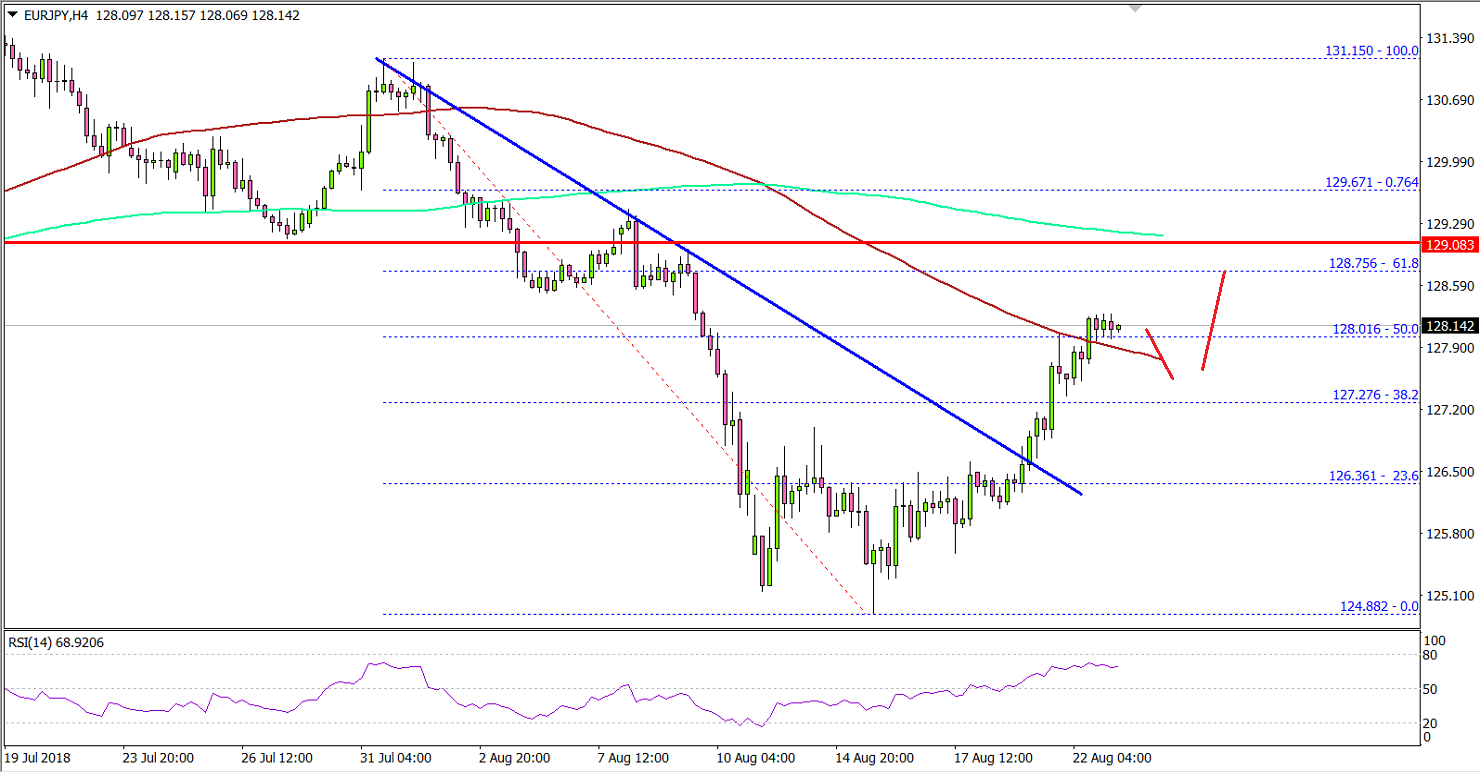 After a major decline, the Euro found support near the 124.85-125.00 zone against the Japanese Yen. The EUR/JPY pair started a solid upward move and climbed above the 126.00 and 127.00 resistances.EURJPY Technical Analysis Euro YenLooking at the 4-hours chart, the pair traded above the 23.6% Fib retracement level of the last decline from the 131.15 high to 124.88 low. Moreover, there was a break above a key bearish trend line with resistance at 1.2670 on the same chart.The pair traded nicely above the 127.00 resistance and it even surpassed the 128.00 level plus the 50% Fib retracement level of the last decline from the 131.15 high to 124.88 low.If the pair continues to move higher, it is likely to test the 129.00 level in the near term, which is a key resistance and coincides with the 200 simple moving average (4-hours).On the other hand, if there is a downside correction, the pair could find support near the 127.40 and 127.20 levels.