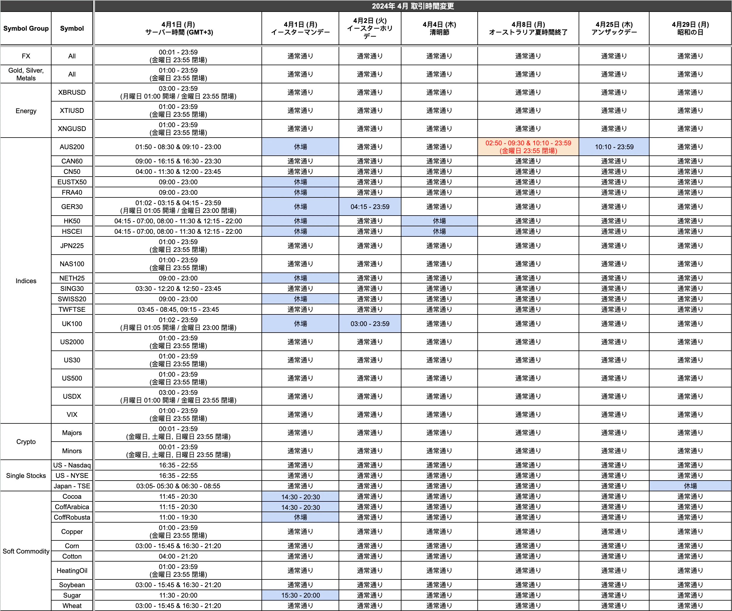 Titan FX Team02nd April 2024イースターホリデー、清明節、 豪州夏時間終了、アンザックデー、昭和の日に伴い、一部取引時間が変更となります。変更の詳細については、以下の表をご覧ください。画像をクリックすると拡大します。上記以外の取引時間は通常通り。 表示時間はサーバー時間 (GMT+3)。ほぼ満足