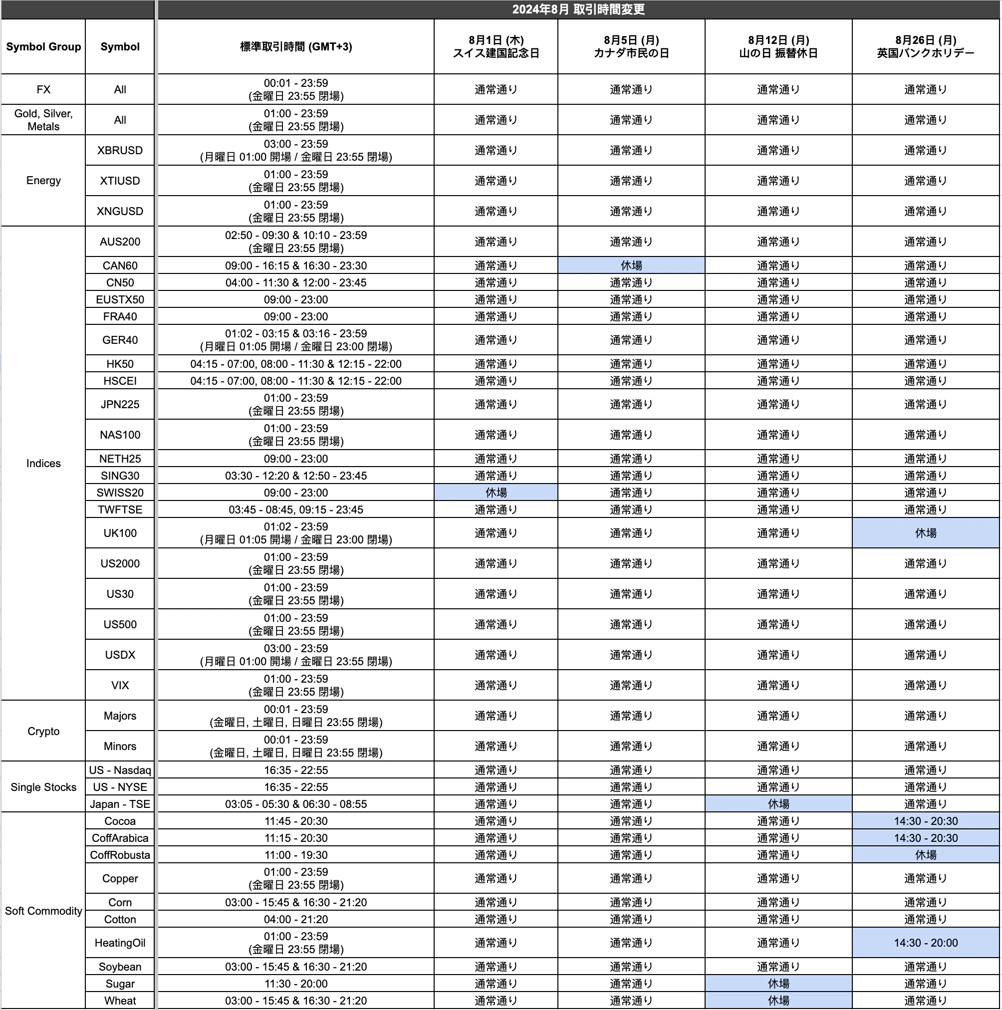 Titan FX Team29th July 20242024年8月1日 (木) スイス建国記念日、8月5日 (月) カナダ市民の日、8月12日 (月) 山の日振替休日、8月26日 (月) 英国バンクホリデーに伴い、8月の一部取引時間が変更となります。変更の詳細については、以下の表をご覧ください。画像をクリックすると拡大します。上記以外の取引時間は通常通り。 表示時間はサーバー時間 (GMT+3)。ほぼ満足