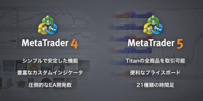 Titan FXでは、MT4とMT5のどちらもお使い頂けます。その他の機能に関しては、こちらも併せてご覧下さい。