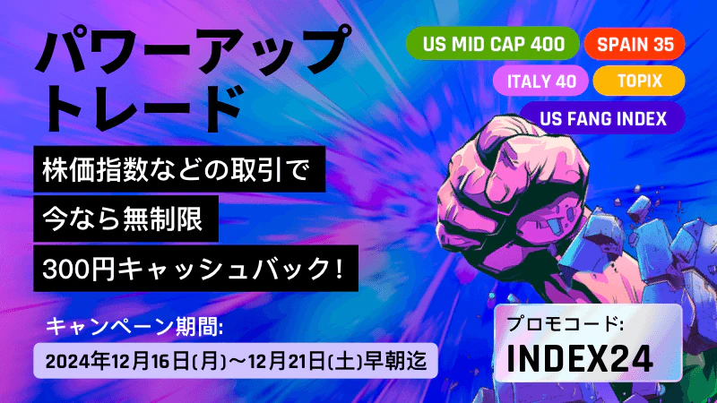 新しい銘柄の追加を記念して、12月16日(月)より「パワーアップトレード」プロモーションを実施いたします。期間内にプロモーションコード「INDEX24」をクライアントキャビネットで入力+参加条件達成で、12月23日(月)以降にキャッシュバックが反映されます。
