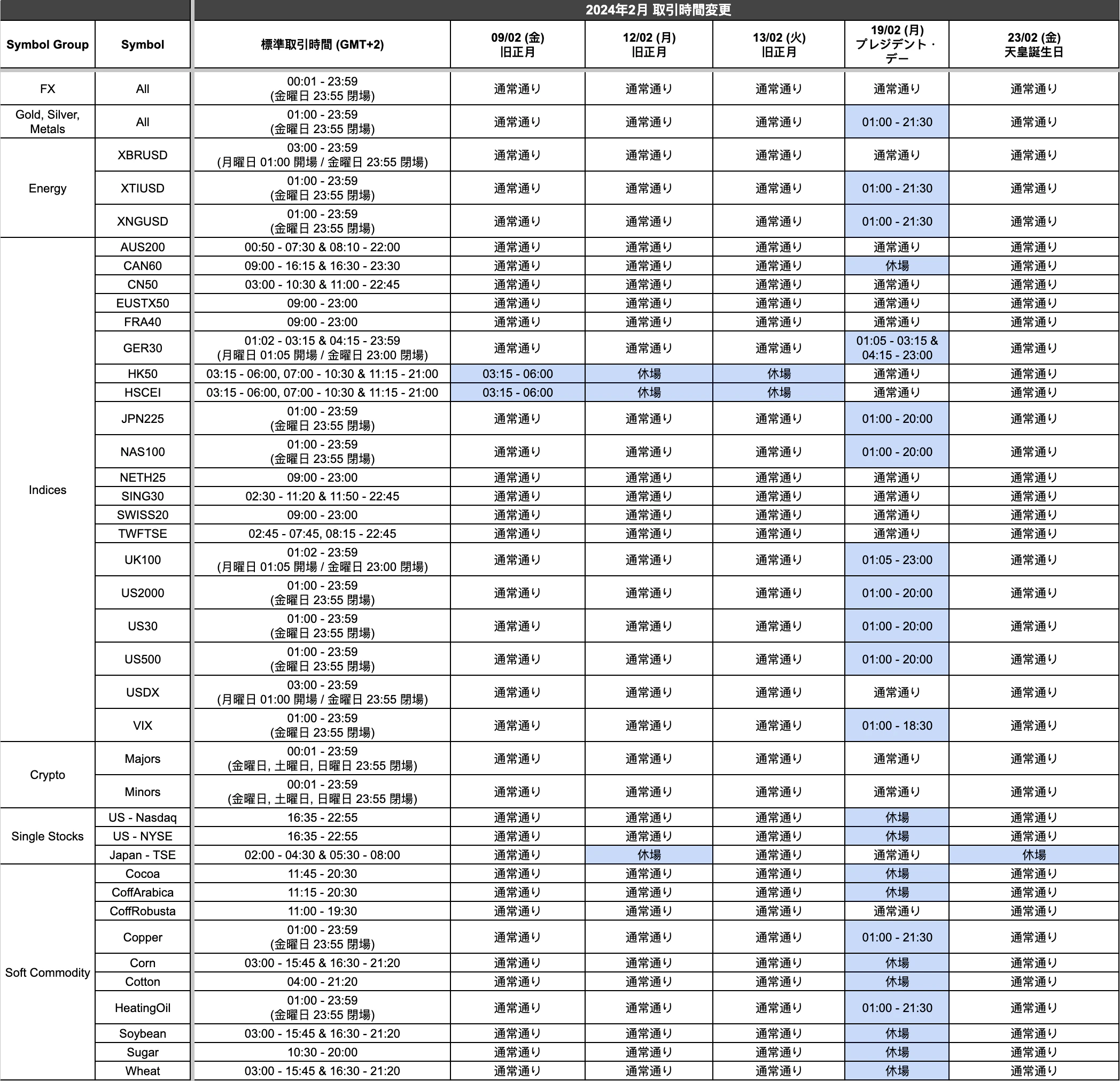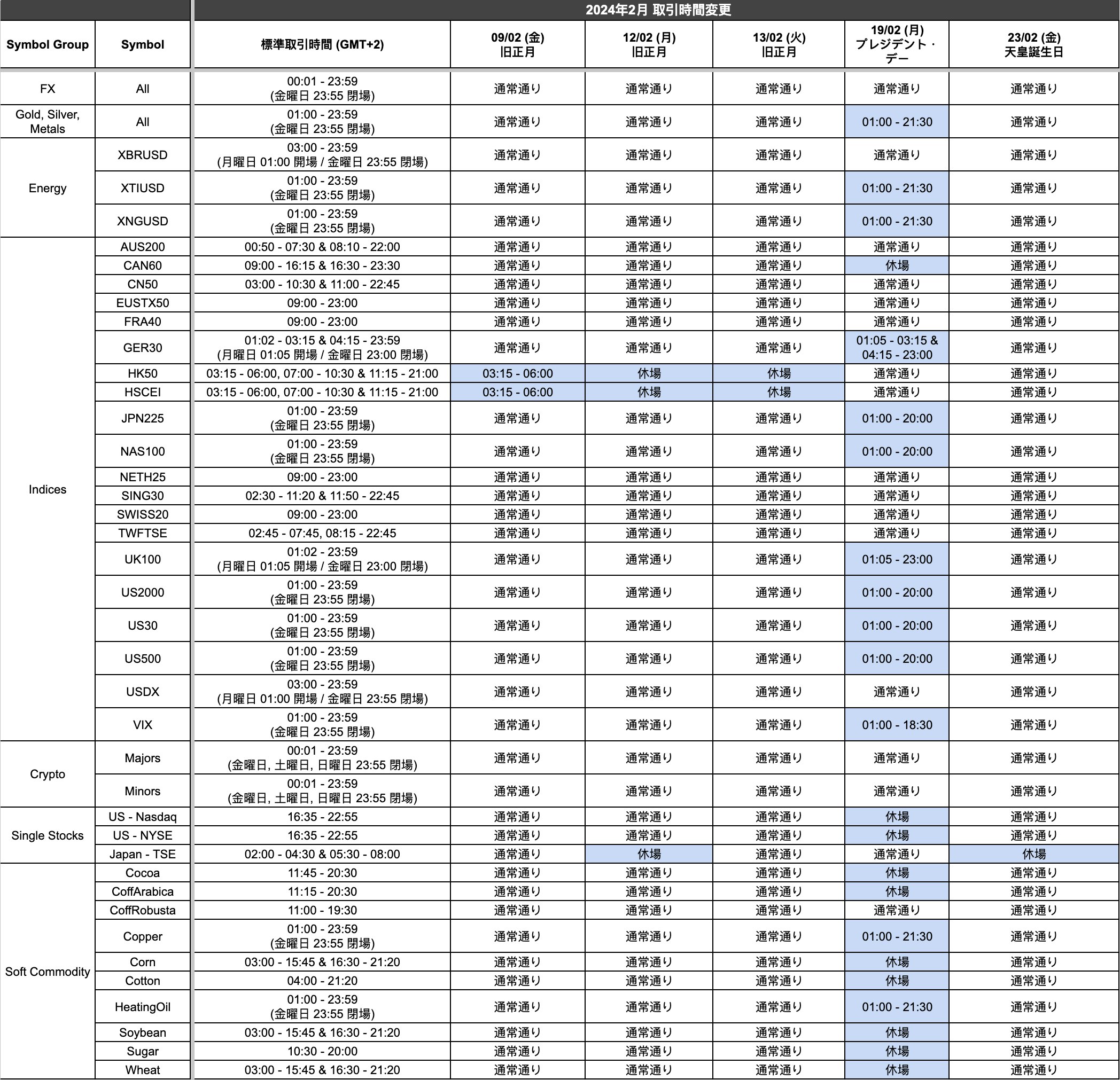 Titan FX Team05th February 2024旧正月、プレジデント・デー(米)、天皇誕生日に伴い、様々な商品の取引時間に変更が生じます。詳細は以下の表を確認ください。画像をクリックすると拡大します。上記以外の取引時間は通常通り。 表示時間はサーバー時間(GMT+2)。ほぼ満足
