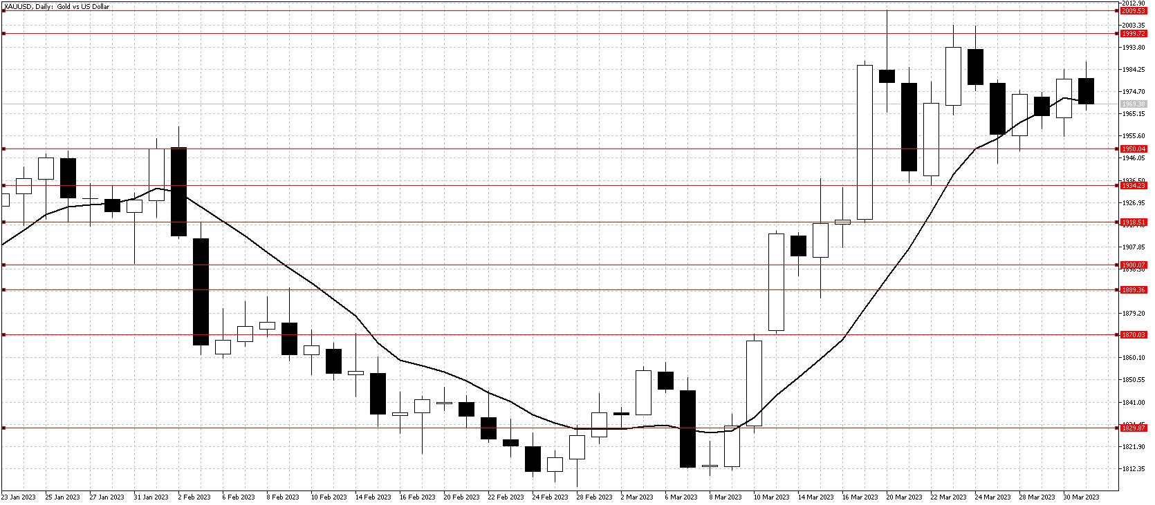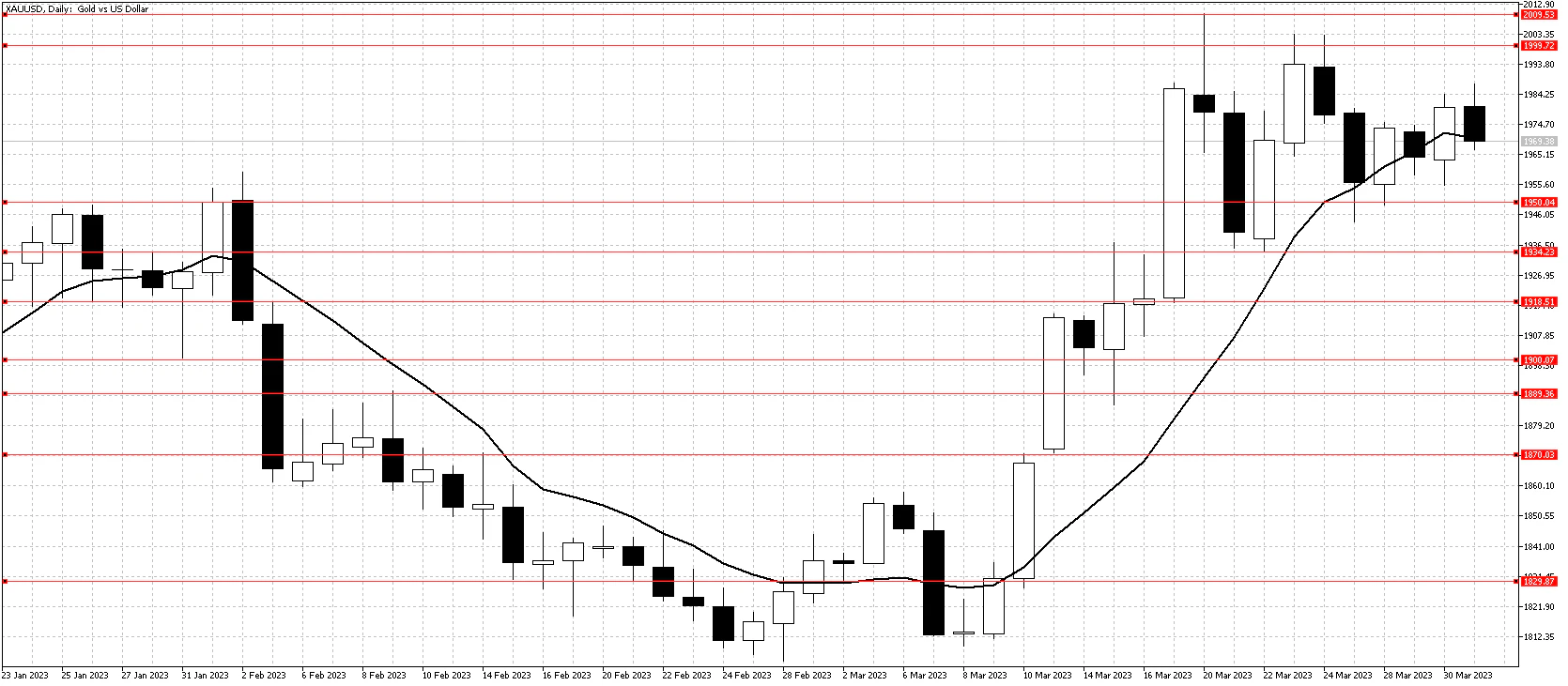 経営破綻した米シリコンバレー銀行の債務整理が行なわれ、ドイツ銀行株が上昇したことにより銀行部門の安定さが示されました。これはリスク回避として買われていたゴールドにとってはマイナス材料です。しかし、10日移動平均線がサポートとして機能したため、テクニカルトレーダーは買い意欲が残っており、週をとおして大きな下落はありませんでした。