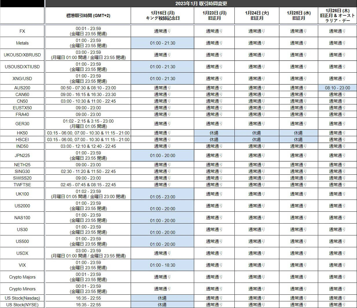 キング牧師記念日、オーストラリア・デーと旧正月に伴い、2023年1月16日 (月)、また23日 (月) ~ 26日 (木) に一部商品の取引時間に変更がございます。