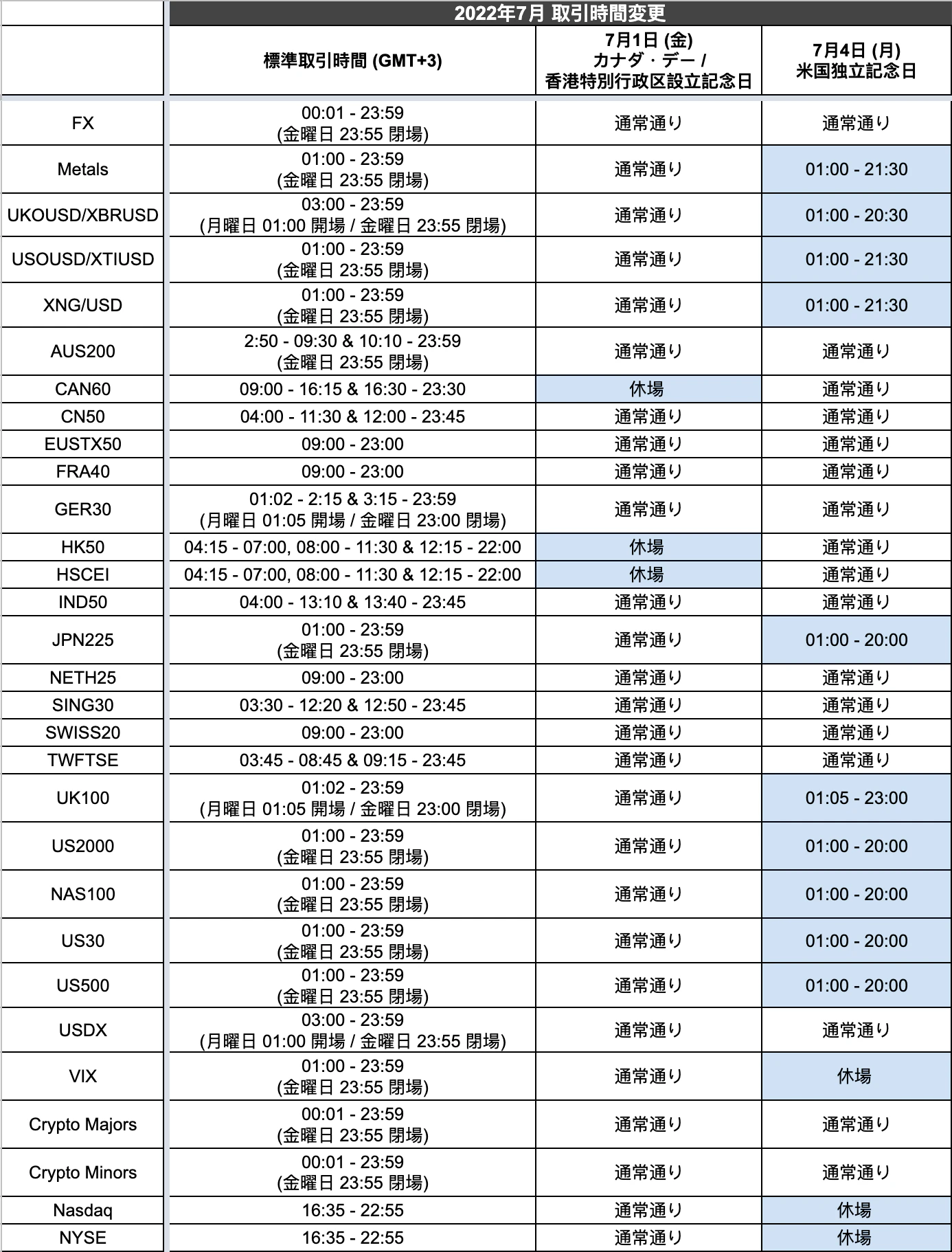 2022年7月1日 (金) カナダ・デー / 香港特別行政区設立記念日、4日 (月) 米国独立記念日に伴い、一部取引時間が変更となります。