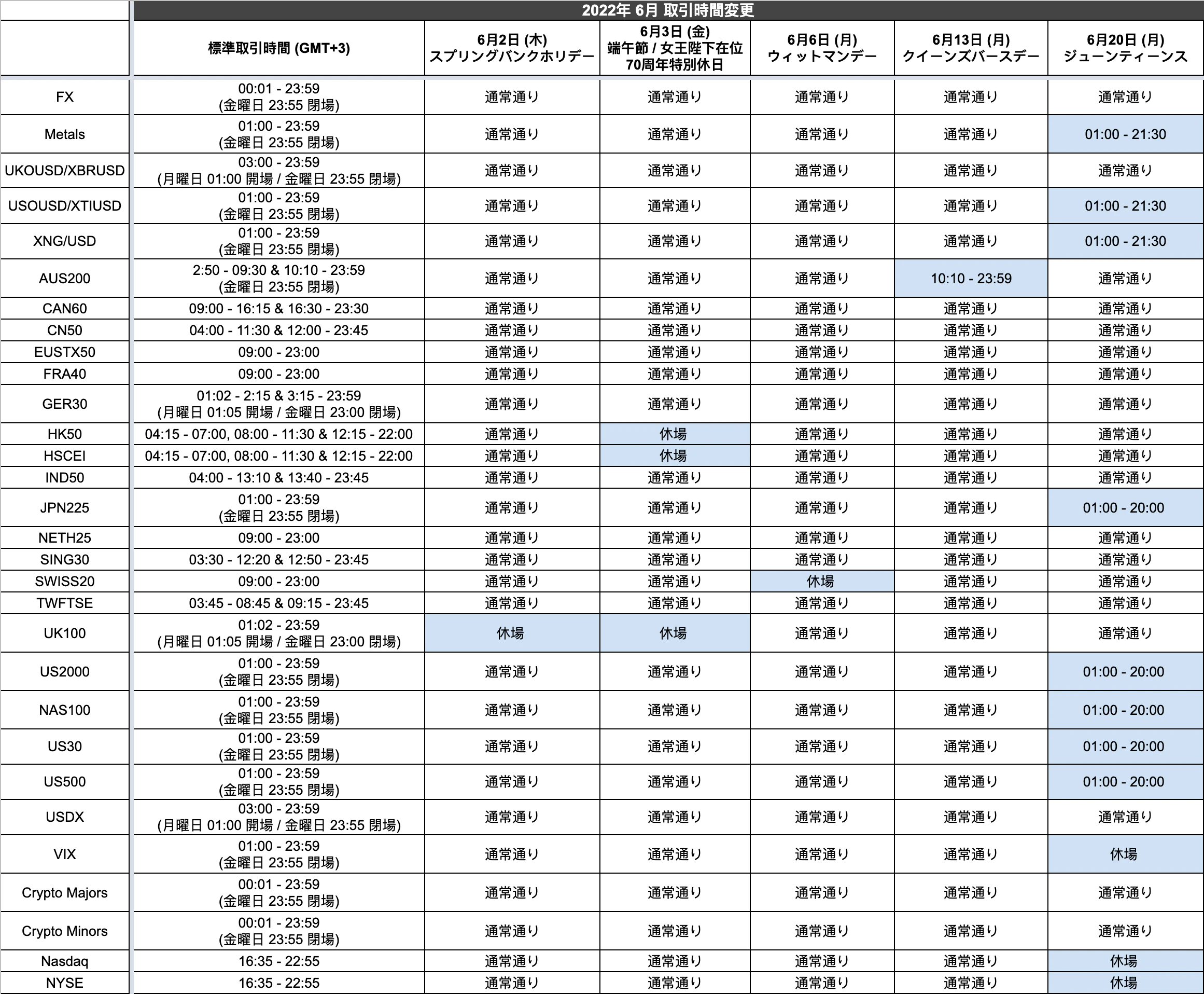 Aayush Jindal30th May 20222022年6月2日 (木) スプリングバンクホリデー、3日 (金) 端午節 /女王陛下在位70周年特別休日、6日 (月) ウィットマンデー、13日 (月) クイーンズバースデー、20日 (月) ジューンティーンスに伴い、一部取引時間が変更となります。影響がある金融商品の詳細は、下記の表をご参照ください。画像をクリックすると拡大します。上記以外の取引時間は通常通り。 表示時間はサーバー時間(GMT+3)。ほぼ満足
