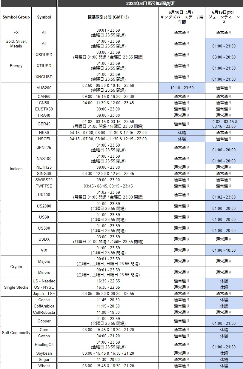 Titan FX Team07th June 20242024年6月10日 (月) キングズバースデー、端午節、19日 (水) ジューンティーンスに伴い、6月の一部取引時間が変更となります。変更の詳細については、以下の表をご覧ください。画像をクリックすると拡大します。上記以外の取引時間は通常通り。 表示時間はサーバー時間 (GMT+3)。ほぼ満足