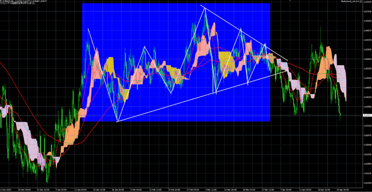 EUR/AUDの4時間足で以前に青枠部分での三角持ち合い、レンジ相場となっていること、三角持ち合いからの抜けで売り買いのチャンスが出る事を予想していたが、その後の展開がどの様になったのかの話をしていきたい。