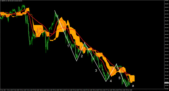 1時間足上では比較的長期間の下降トレンドと11月20日から付けた下降トレンドにて波動論上の推進波1-5波を付けたと思われ、現在は調整波aの形成途中と考えられる。