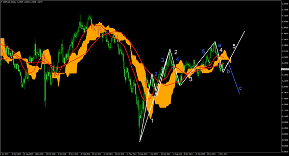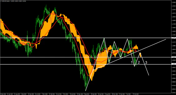 EUR/USDの週足では2023年より2年間近くレンジ状態で推移していたが、2024年10月末に下抜ける形(三角持ち合いの下抜け)となっている。