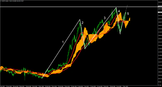 5波の形成がなされるのであれば、3-4波で形成された高値を超えてくる形となり、高値更新部分での買い目線、若しくは移動平均線から大きく乖離した部分(3-4波の高値を超えて上昇が一巡した部分)での売り目線(グランビルの法則上の)となる部分となっている。