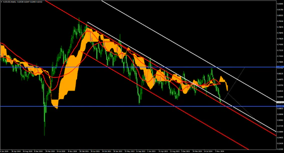 AUD/USDの週足は少しややこしい図になるが、結論としては下降した場合には下値抵抗線部分での反発となる可能性がある。