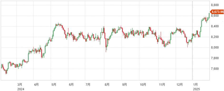 英国市場は米国トランプ大統領が就任初日に予定されていた関税導入を控えた事が市場の安心を呼び、2年ぶりの月間での上昇となっている。