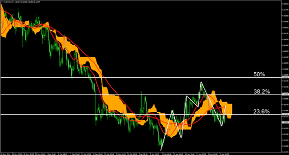 AUD/USDの4時間足は直近の下降トレンドの50%、38.2%、23.6%の全てが意識されており、現在の価格は23.6%を意識した後に、23.6%が上値抵抗線に変化しつつある形となっている。