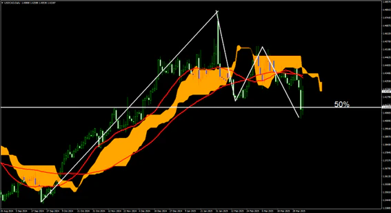 日足上では直近の下降トレンドの半値、50%を意識する部分となっており、ここから一旦は戻りを試す可能性もあるが、長期で見た場合、関税措置などの影響を見た場合には下降トレンドへの転換の可能性となりそうだ。