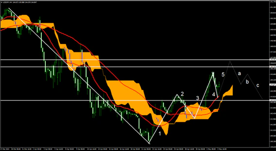 USD/JPY4時間足上では上昇トレンドの推進第4波の形成がなされている。