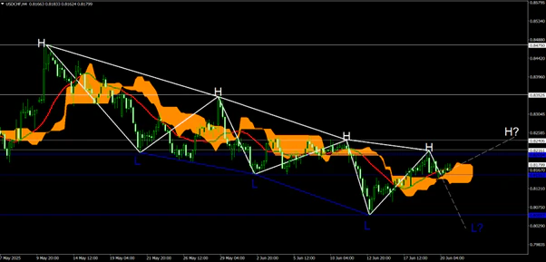 USD/CHFの4時間足はダウ理論上での高値安値の切り下げ(図中H・L)を行って下降トレンドが継続しており、現在は高値の切り下げを行った部分となっている。