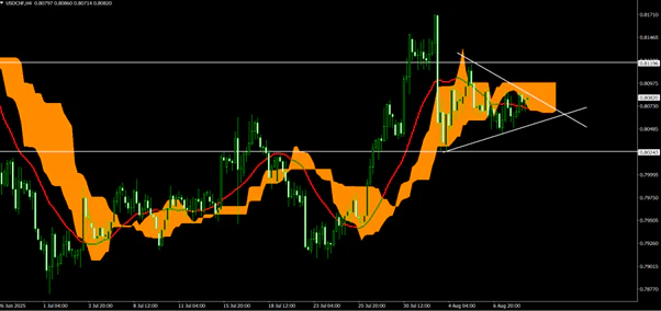 USD/CHF4時間足は三角持ち合いの形成となっている。