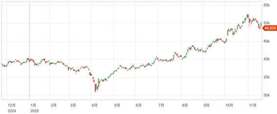 10月末に52,000円台から実に4,000円近い下落となっており、調整局面が強く出ている。