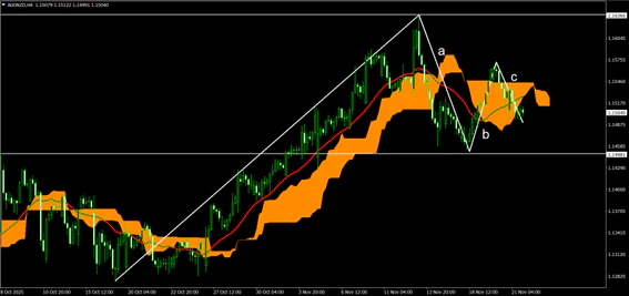 売りで保持をした場合にはb-c波で形成される高値がロスカットの目安となり、a-b波で形成された安値を抜ける形になれば、ある程度の下値余地も考えられる。