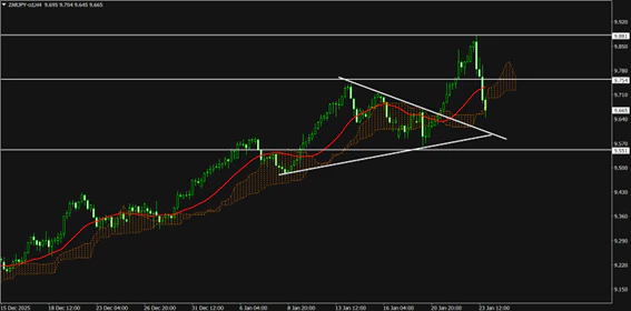 ZAR/JPYは三角持ち合いからの上値抜けを見せた後に値を戻す展開となり、再度下抜きの可能性を試す部分となっている。