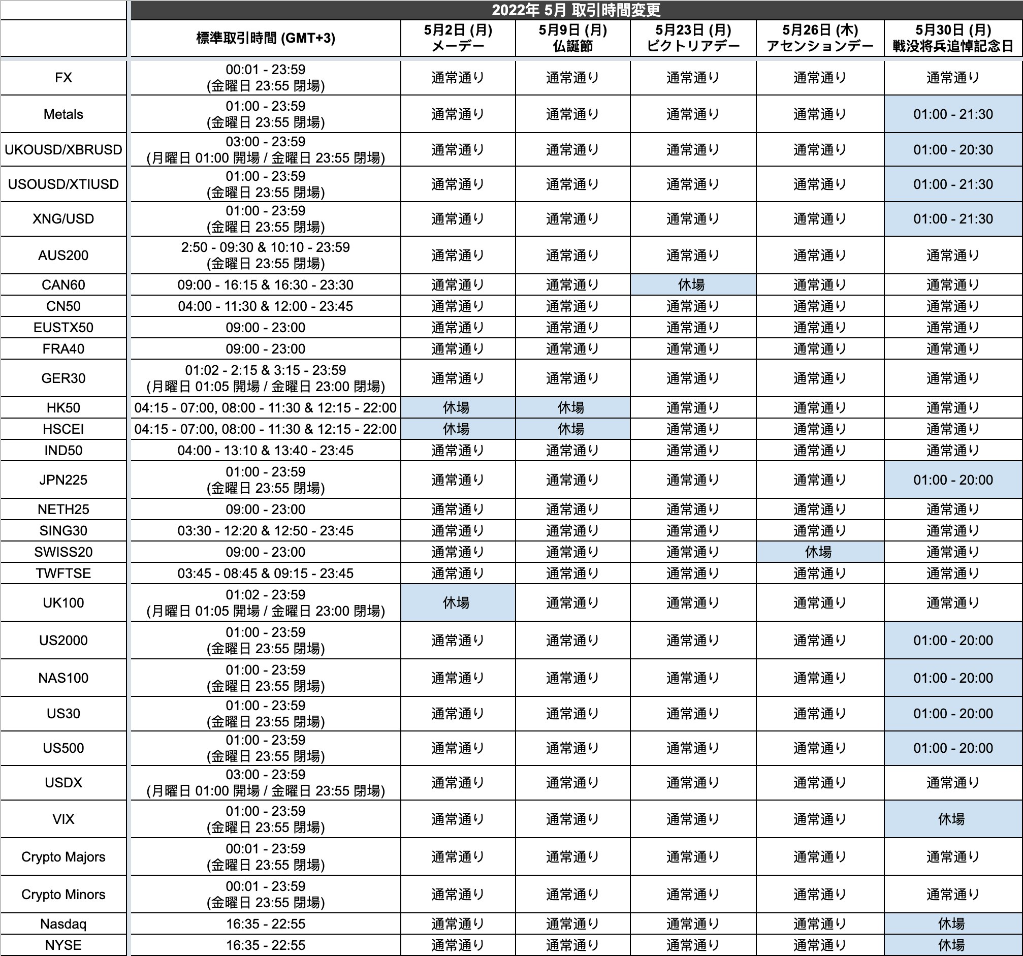 2022年5月2日 (月) メーデー、9日 (月) 仏誕節、 23日 (月) ビクトリアデー、26日 (木) アセンションデー、 30日 (月) 戦没将兵追悼記念日に伴い、一部取引時間が変更となります。