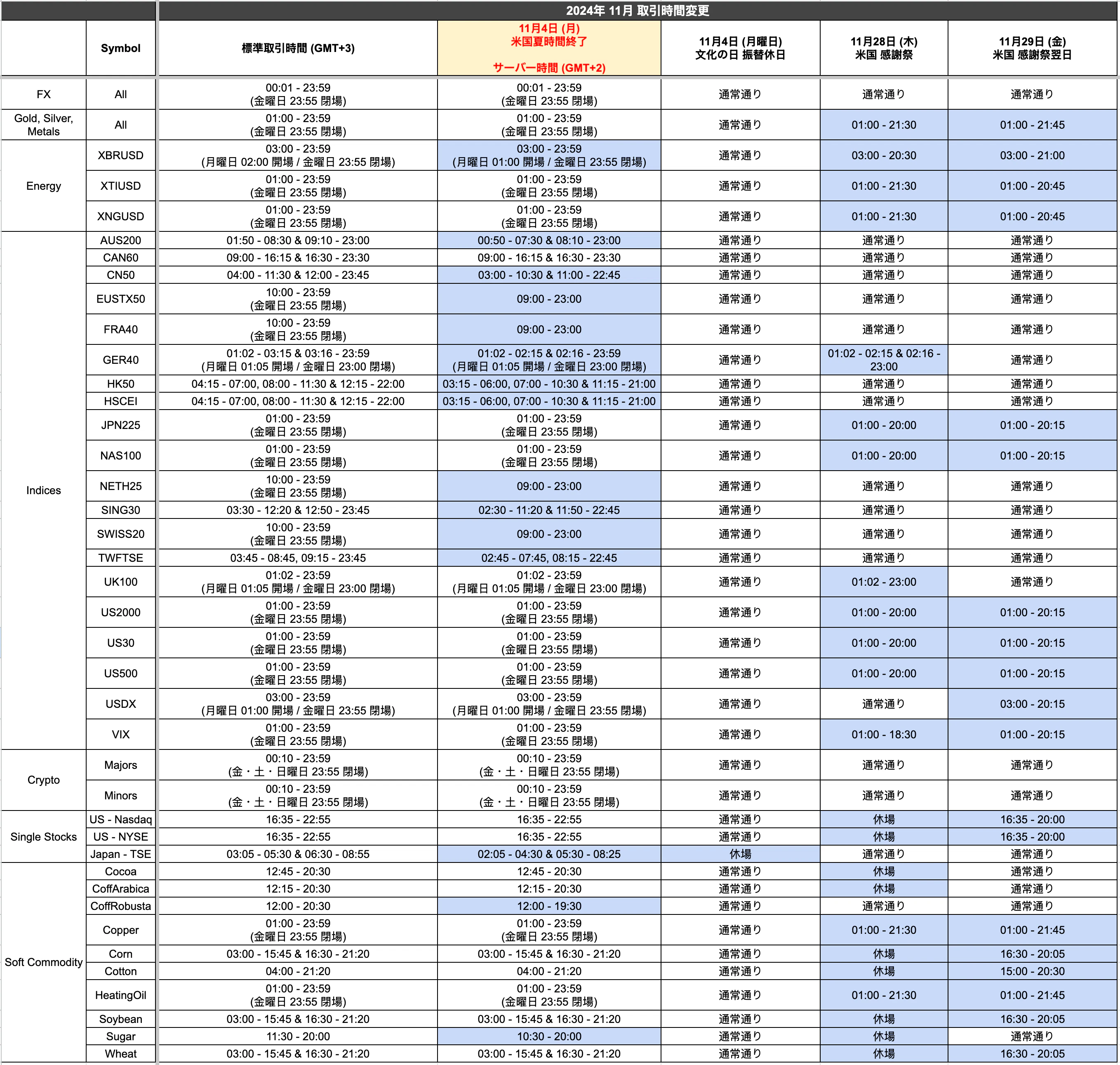 Titan FX Team28th October 2024米国夏時間の終了に伴い、2024年11月4日 (月) 以降、MT4及びMT5のサーバー時間がGMT+3からGMT+2に変更となり、一部商品の取引時間に変更が生じます。また、4日 (月) 文化の日振替休日、28日(木) 米国感謝祭、29日(金) 米国感謝祭翌日により、一部の取引時間も変更となります。変更の詳細については、以下の表をご覧ください。画像をクリックすると拡大します。上記以外の取引時間は通常通り。 表示時間はサーバー時間 (GMT+3)。ほぼ満足