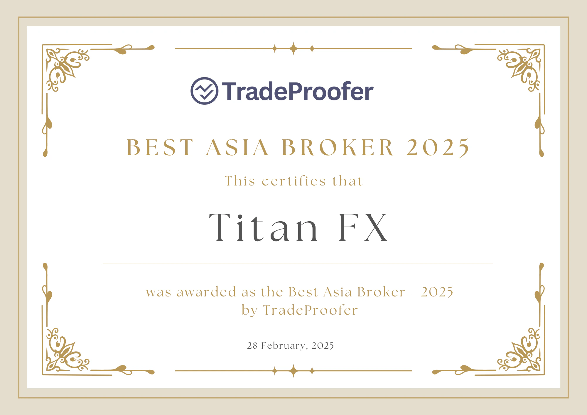 このたびTitan FXは、信頼性の高いプラットフォーム「TradeProofer」において、「Best Asia Broker 2025」の栄誉に輝きました。​本受賞は、当社がアジア地域において卓越した取引環境、透明性の高いサービス、ならびに顧客満足度において高い評価を得ていることの証です。
