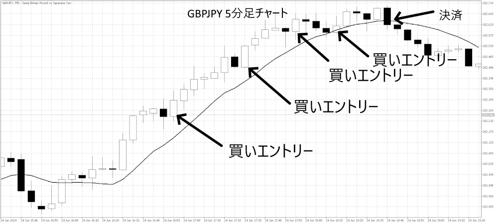 下のチャートで、移動平均線が上向きのトレンドを示し、サポートしていることがわかります。移動平均線が強く上向きまたは下向きを指している場合、そのトレンドに先んじて買いまたは売りに入るのは良い方法です。市場が移動平均を下回ってクローズした時にトレードを決済します。