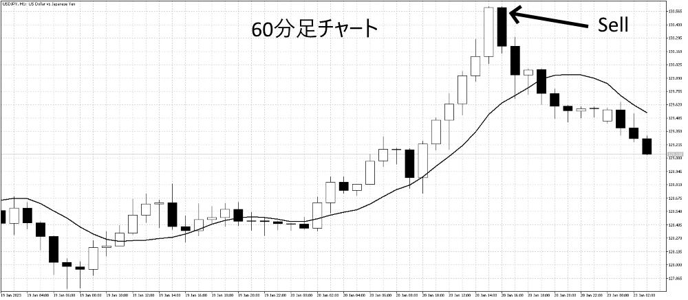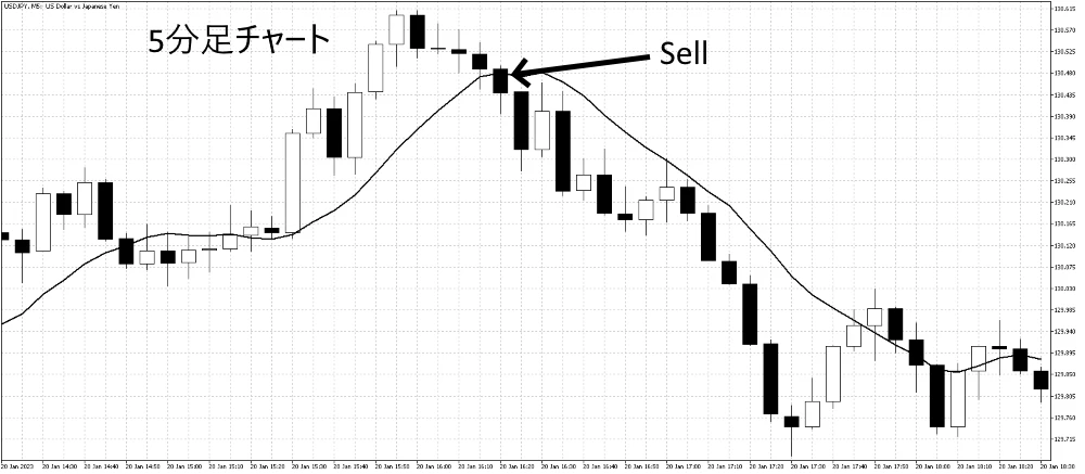 先ず、2つのチャートそれぞれでマーケット状況の確認をします。下図の場合、60分足チャートで移動平均線から価格が大きく上へ乖離していることが分かります。そして、価格は移動平均線へ戻ろうと下がり始めたところです。このタイミングは戻り売りの機会となります。そこで、エントリ―タイミングを計るため、5分足チャートの状態を確認します。5分足チャートでも移動平均線からの大きな乖離を見せた後、戻りの動きを見せ始ました。このタイミングは戻り売りの絶好のエントリー機会となります。このように5分足チャートが60分足チャートと同様に戻り売りのタイミングになったことを確認してからエントリーするようにします。反対に、