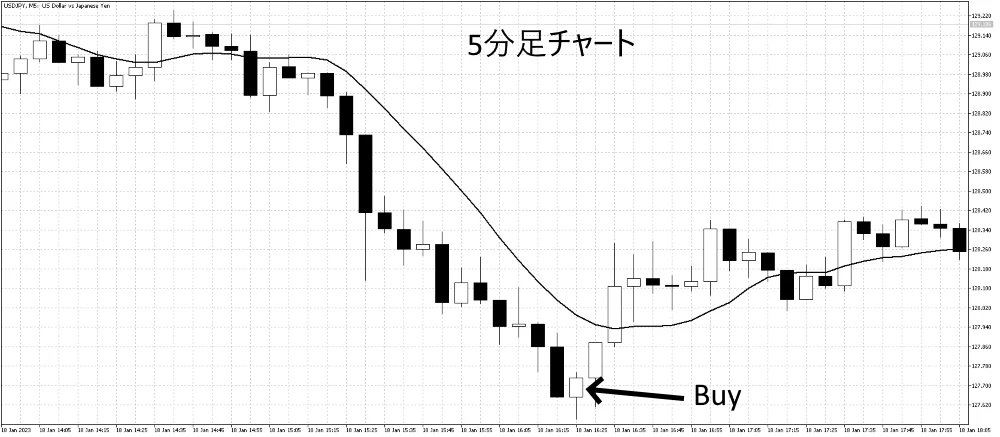 例1.と同様に、先ず、2つのチャートそれぞれでマーケット状況を確認します。下図の場合、60分足チャートでは移動平均線に対して、価格が下方へ大きく乖離し、売り過ぎの状態になっていることが分かります。そして、価格は移動平均線へ戻ろうと上がり始めたところです。このタイミングは買いエントリーの機会です。そこで、エントリータイミングを計るため、5分足チャートの状態を確認します。5分足チャートでは、下向きだった移動平均線が横ばいとなり、その移動平均線を価格が上抜けました。このタイミングは絶好の買いエントリー機会となります。今回のように、より短い時間足チャートが上昇してくることでそれに伴い、長時間足チャートも上昇してくることを狙ったトレードテクニックです。
