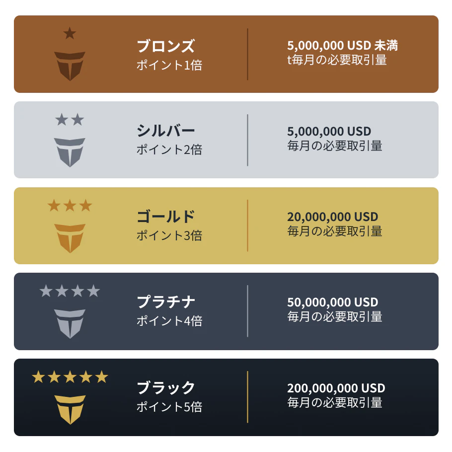 月間の取引量に応じて変動する5レベルのステータスが用意されており、ステータスが上がるとポイント倍率も高くなる仕組みです。最初は「ブロンズ」ステータスから始まり、最高レベルである「ブラック」ステータスに達するとポイント倍率が5倍になります。また、デイリー・ウィークリー・マンスリーのクエストを達成することでもポイントが獲得できるので、取引以外の方法でもポイントを獲得が可能です。